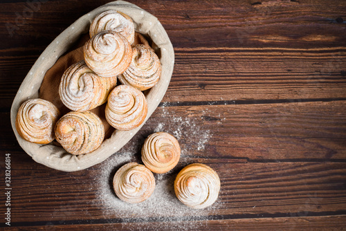 Delicious modern cruffins are made from layered croissants in the shape of a muffin. cruffins with a wooden basket on a dark background, sprinkled with powdered sugar.