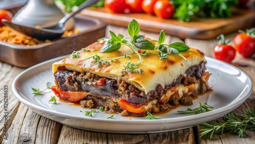 Delicious Moussaka, Fresh Thyme, Ready to Eat, Gourmet Dish, White Plate, Appetizing Photo