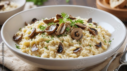 Delicious mushroom risotto garnished with fresh herbs served in a white bowl, perfect for a gourmet meal.