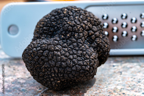 Delicious mushrooms, fresh black summer truffle mushroom and grater for making truffle dishes with tasty aroma