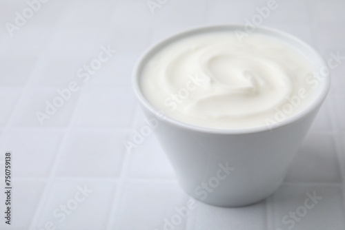 Delicious natural yogurt in bowl on white tiled table, closeup. Space for text