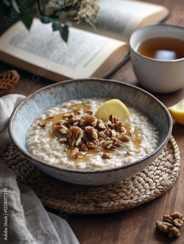 oatmeal, honey, walnut, lemon, rustic, breakfast, bowl, healthy, meal, homemade, porridge, natural, fiber, nourishment, cosy, warm, wholesome, tasty, fresh, organic, cereal, nut, citrous, decoration, table, woven, texture, clothes, napkin, ceramic, plate, cup, tea, beverage, wood, book, reading, calm, peaceful, morning, refreshing, garnish, spoon, utensil, dining, lifestyle, food, simple, delicious