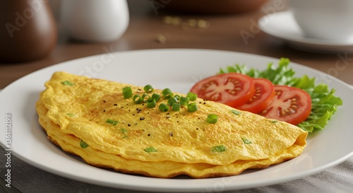 Delicious Omelette Dish with Tomato and Lettuce on a White Plate
