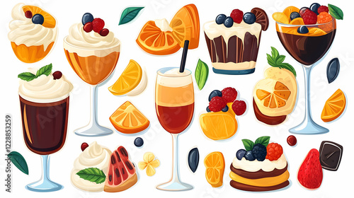 dessert, drink, orange, berry, collection, menu, food, design, culinary, sweet, delicious, tasty, receipe, eatery, cafes, bar, cocktail, juice, pastry, cake, pie, pudding, mousse, cream, fruit, berry, chocolate, summer, refreshment, healthy, vitamin, epicure, fresh, appetising, illustration, graphic, vector, isolated, background, white, clip art, image, photo