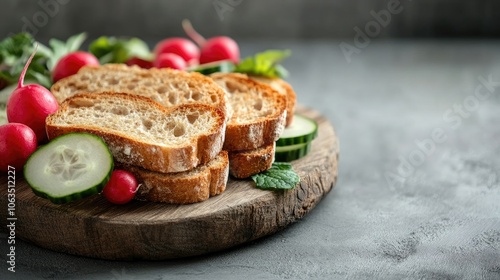 Delicious organic bread toasts arranged on a wooden platter, accompanied by fresh red radish and cucumber, with a selective focus and ample copy space for your design needs.