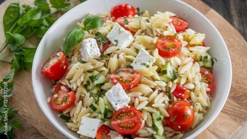 Delicious Orzo Salad with Cherry Tomatoes and Feta Cheese. A vibrant orzo salad featuring fresh cherry tomatoes, cucumbers, basil, and feta. Perfect for healthy meals or gatherings!