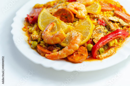 Delicious paella, cooked risotto rice with chicken thigh, king prawns, tomatoes and chorizo