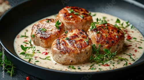 Delicious Pan Seared Pork Medallions in Creamy Thyme Sauce Gourmet Food Dish