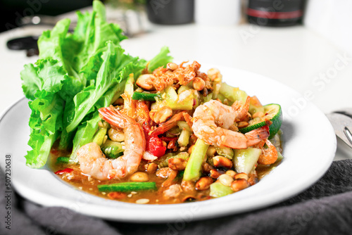 shrimp, food, asian, salad, thai food, diet, dinner, papaya, cookery, seafood, background, chili, cooking, copy, delicious, dish, eat, fork, fresh, epicure, healthy, hot, lemon, lentil, light, lime, lunch, meal, meat, menu, nut, plate, repast, eatery, sauce, silverware, space, spicey, studio, siam, tomatoes, top, traditional, vegetable, wood