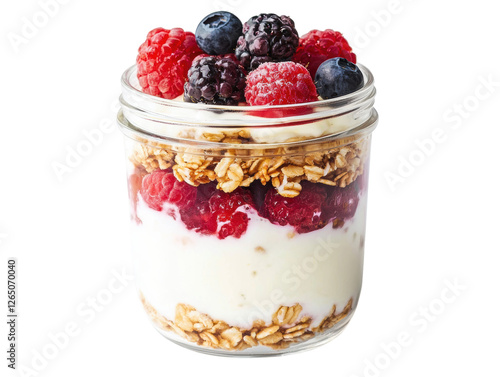 Delicious parfait in a jar with yogurt, granola, and mixed berries on a white isolated background. transparent PNG