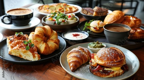 pastry, hot drink, breakfast, brunch, cafes, bakery, croissant, sweet, sugar, bread, food, dessert, wooden table, table, plate, cup, mug, beverage, drink, eatery, morning, delicious, appetising, tasty, epicure, indulgence, treat, flaky, gold, brown, sprinkle, topping, cream