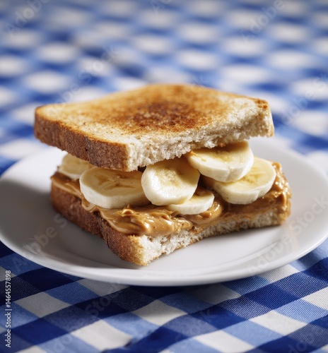 Delicious Peanut Butter and Banana Sandwich on Toast Served on a Plate with Blue and White Checkered Tablecloth Background