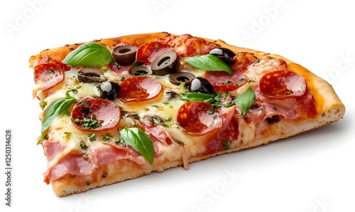 Delicious pepperoni, olive pizza slice, isolated, food photography, restaurant menu