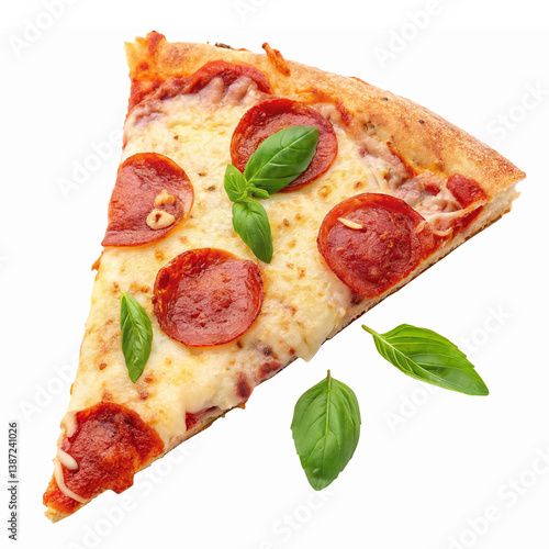 Delicious Pepperoni Pizza Slice with Fresh Basil Leaves on Transparent Background
