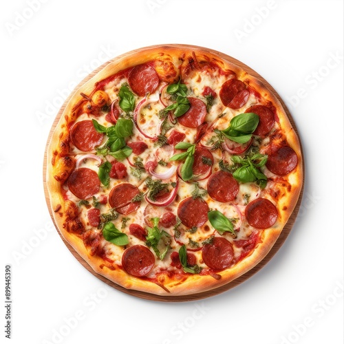 Delicious pizza with salami served on wooden plate isolated on white background.