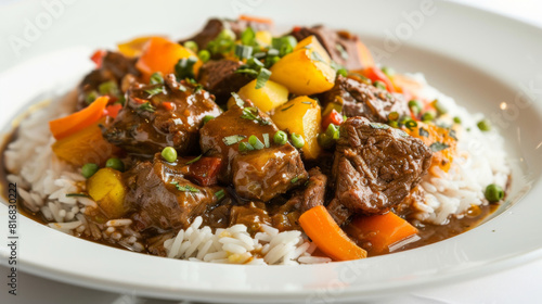 Delicious plate of african beef stew served with white rice, garnished with diced vegetables and green peas, on a white background