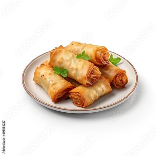 chinese, plate, food, sauce, dipping, fried, crunchy, spring roll, asian, isolated, white background, snack, vegetable, fresh, generative, ai