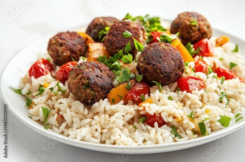 Delicious plate of rice served with savory meatballs and colorful vegetables garnished with fresh herbs on a light background for culinary delight