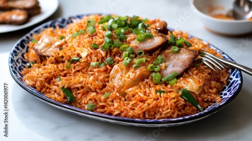 Delicious Plate of Savory Rice and Tender Meat Garnished with Herbs