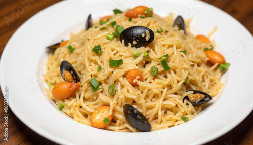 Delicious plate of seafood pasta with mussels and almonds