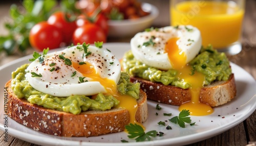 Delicious poached eggs on toast with avocado, morning breakfast delight