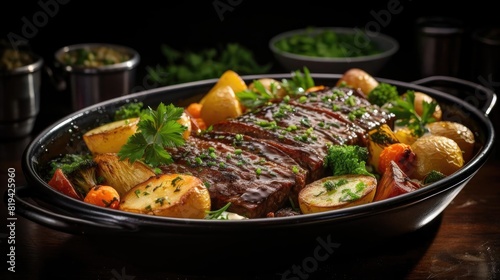 delicious pot roast meat with black and blur background