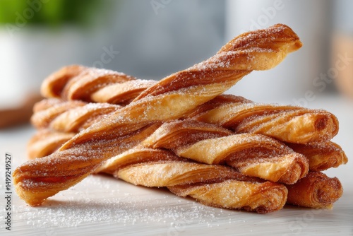 Delicious puff pastry twists sprinkled with sugar, arranged on a white wooden surface, showcasing a tempting bakery treat with a sweet flavor, perfect for a snack or dessert.