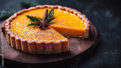 Delicious Pumpkin Pie with Cinnamon and Star Anise Garnish on Dark Rustic Background