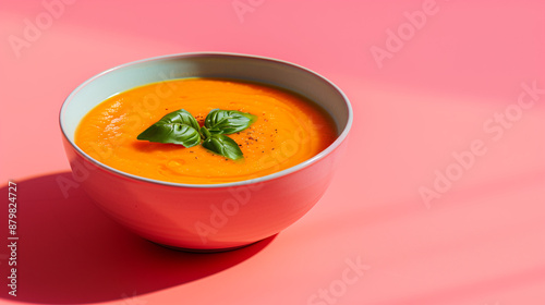 Delicious Pumpkin Soup in a Bowl on a Pink Background