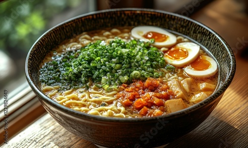 ramen, noodle, broth, soup, egg, yolk, green onion, scallion, garnish, savoury, tasty, delicious, food, meal, lunch, dinner, japanese, asian, cookery, comfort food, warm, hearty, spicey, rich, bowl, dark, wooden table, window, sunlight