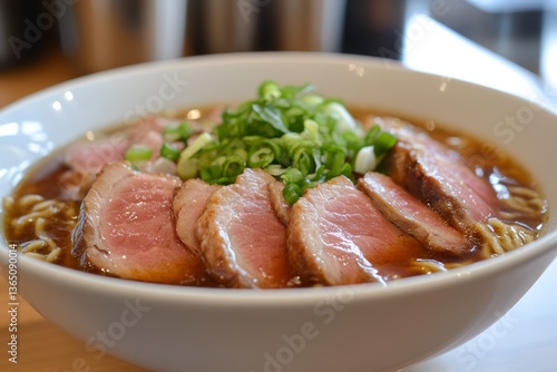 Delicious ramen bowl topped with tender slices of meat and fresh green onions served in a cozy restaurant setting