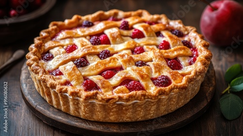 pie, raspberry, blackberry, crust, fruit, baking, dessert, sweet, pastry, food, delicious, tasty, homemade, fresh, sugar, gold, red, brown, wooden, table, rustic, plate, trellis, lattice, top, filling, juicy, summer, autumn, fall, treat, warm, comfort, sweetness, bakery, cook, receipe, kitchen, traditional, classic, flaky, crispy