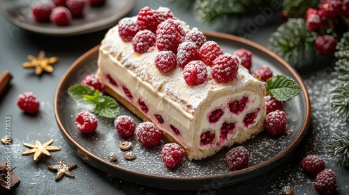 cake, dessert, raspberry, christmas, christmas, log, sweet, holiday, food, bakery, delicious, culinary, pastry, sweetness, winter, treat, creamy, red, white, sugar, frosting, confectionery, baking, patisserie, epicure, gastronomy, festive, seasonal, mint, plate, powdered, deliciously