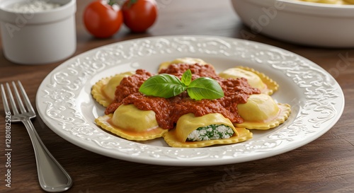 Delicious Ravioli Dish with Tomato Sauce and Basil on White Plate