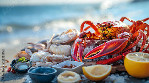 Delicious Red Crab Seafood Feast Ocean Beach Summer Meal Claws Fresh Tasty Plate Water Image Dinner