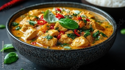 chicken, curry, thai, red, food, cookery, dish, meal, dinner, lunch, tasty, delicious, spicey, hot, flavorful, aromatic, basil, chili, pepper, coconut, milk, sauce, vegetable, herb, ingredient, receipe, cooking, eat, healthy, bowl, plate, dark, background, photo, gastronomy, culinary, appetising, eatery, kitchen, enjoy, summer