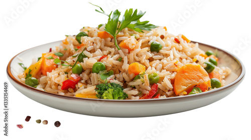 rice, vegetable, food, dish, meal, cookery, healthy, delicious, fresh, cooked, plate, serving, lunch, dinner, nourishment, diet, vegetarian, vegan, eating, culinary, ingredient, carbohydrate, protein, vitamin, mineral, fiber, broccoli, carrot, pea, pepper, parsley, garnish, eatery, cafes, catering, menu, receipe, homemade, cooking, epicure, closeup, transparent, background, isolated, white