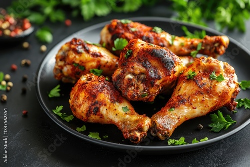 Delicious roasted chicken drumsticks on a black plate, garnished with fresh parsley.