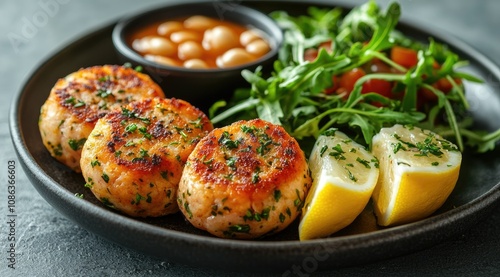 Delicious salmon cakes served with baked beans, arugula salad, and lemon wedges on a dark plate.