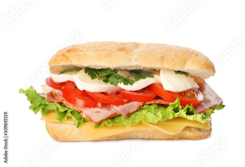 Delicious sandwich with fresh vegetables and mozzarella isolated on white