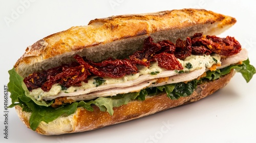 Delicious sandwich with ham, sun-dried tomatoes, and creamy dressing served on freshly baked bread