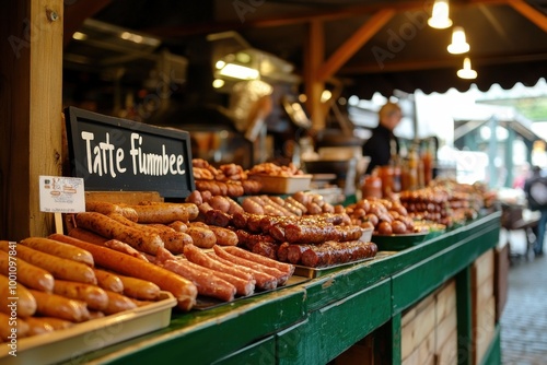 sausage, baked goods, market, display, rustic, traditional, local, produce, snack, meat, pastry, bakery, retail, shopping, cookery, delicious, appetising, tempting