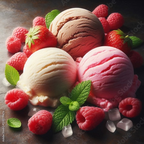 Delicious Scoops of Vanilla, Chocolate, and Strawberry Ice Cream Garnished with Fresh Raspberries and Mint in a Rustic Wooden Bowl for a Perfect Indulgent Dessert Experience