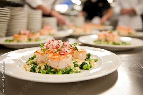 seafood, dish, epicure, radish, greener, presentation, culinary, chef, kitchen, plate, meal, cookery, eatery, favor, ingredient, cooking, shrimp, scallop, vegetable, herb, food, life events, taste, fresh, savoury, upscale, art, creativity, skill, gastronomy, delicacy, visual, texture, vibrant, stylish, ensemble, hospitality