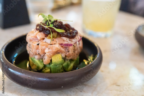 tartare, salmon, avocado, seafood, raw, epicure, stacked, fresh, plating, presentation, texture, topping, dish, sauce, eatery, bowl, cookery, elegant, upscale, closeup, culinary, healthy, modern, herb, garnish, favor, ingredient, onion, eat, meal, round, food, stylish, social, dining, candid, atmosphere, chef, snack, taste, art, seasonal, rich, light, blend, fish, enjoyment, style
