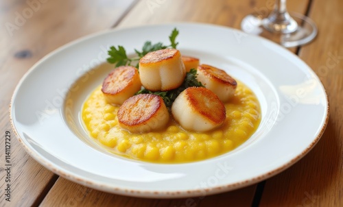 scallop, risotto, epicure, food, seafood, cookery, elegant, dining, plating, eatery, yellow, creamy, herb, culinary, savour, delicious, meal, garnish, fine dining, chef, cooked, tasty, presentation, luxury, plate, wooden table, fresh, sophisticated, healthy, cooking, gastro, sauce, elegance, epicure, aromatic, taste, catered, dish, seared