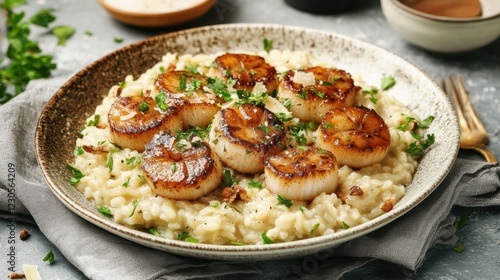 scallop, risotto, creamy, seared, parsley, seafood, epicure, delicious, savoury, meal, dinner, dish, cookery, rice, italian, receipe, culinary, herb, garnish, plate, food, cooked, texture, elegant, eatery, homemade, fresh, bowl, butter, design, appetising, lunch, grain, rich, favor, succulent, artistic, presentation, tasty
