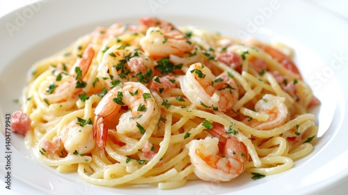 Delicious shrimp pasta dish served with fresh herbs and a creamy sauce at a cozy dining setting