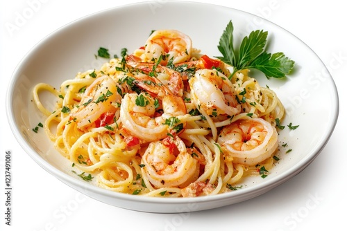 shrimp, scampi, pasta, spaghetti, dish, bowl, white, delicious, food, meal, cookery, italian, seafood, plate, parsley, garlic, butter, olive, oil, pepper, salt, herb, sauce, creamy, savoury, appetising, tasty, dinner, lunch, accessing, eatery, cooking, receipe, epicure, fresh, healthy, ingredient, tomatoes, spice