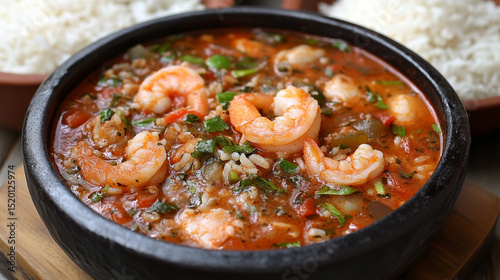 Delicious shrimp stew featuring a rich tomato-based broth with rice and herbs, served in a traditional dark bowl. A hearty, flavorful dish.